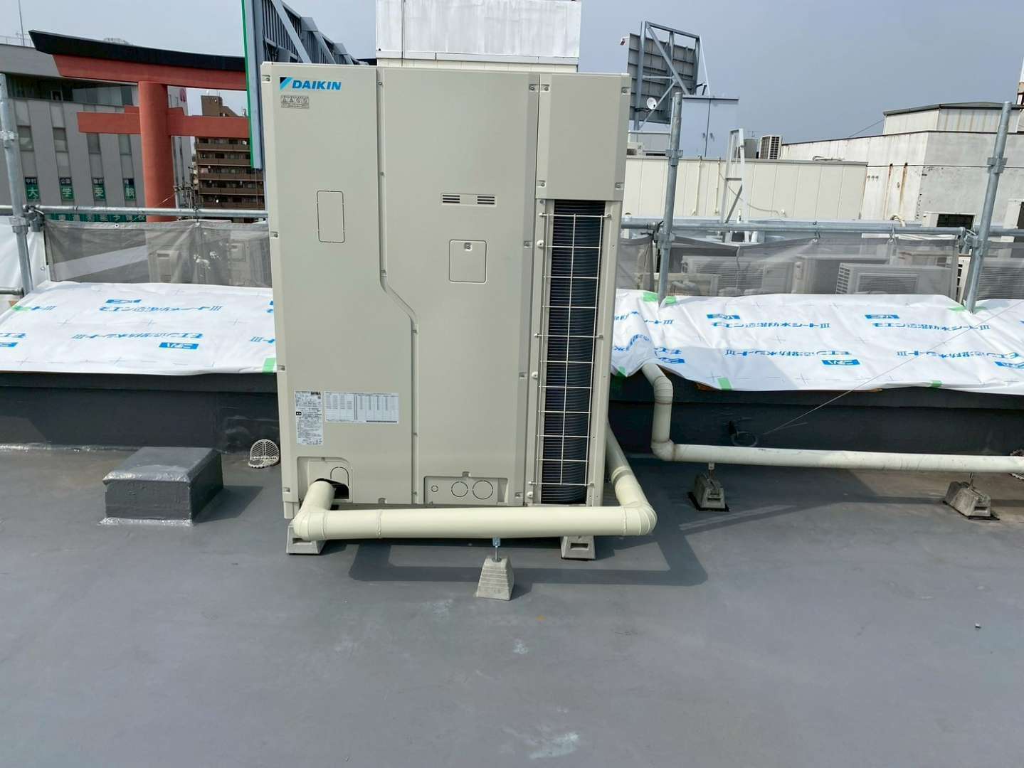 今回の工事では、中高層ビルの屋上部分に室外機を設置する必要があり、クレーンによる荷揚げ作業を実施。周囲の安全管理や通行への配慮を徹底しながら、計画的に作業を進めました。また、店舗の内装デザインと調和するよう、室内機の配置や仕上がりにも細心の注意を払っています。
